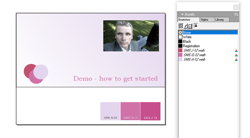 Now save your chosen SMS colours as png or TIFF/TIF, which you can import into your application. Always embed the sRGB profile with the file. NOTE: If you are designing a website and you don't happen to have an EyeDropper Tool, you can always pick up the HEX values of your chosen SMS colours in Photoshop and simply enter them to create the swatches in your app. However, in our example, we are going to start by designing everything - website, letterheads, envelopes, business cards and leaflets in sRGB format suited for Internet viewing, since our customer is in another country and we are on a deadline (and would like to save ourselves the cost of printing out proofs and mailing them overseas). Working with curves (Illustrator, Indesign, Affinity Designer, CorelDraw etc.) Here is just a simple example that gives you an idea of what your workspace might look like. Open the application you want to use for your job. Be sure to select sRGB as your RGB colourspace before you get started. Create a new document. Import/place your colours in sRGB format to your workspace. Place them either inside our outside the working area, depending on whether you want your customer to see his actual SMS colours - or not. Here we have some curves, some text and one bitmap image - in sRGB format. This is a simple suggestion of how, what you send to your customer could look like. The job - lets say this is an M-65 envelope is simply outlined with a box, - but that's just a suggestion, not a requirement. The SMS bitmap colourcubes are in this case included with the softproof in their original bitmap format but they are of course outside the working area, since they are not to be printed on the envelope. Use the EyeDropper tool to either add the SMS colours directly to your graphics or optionally to your colour palette/swatches within your working space - like here below: