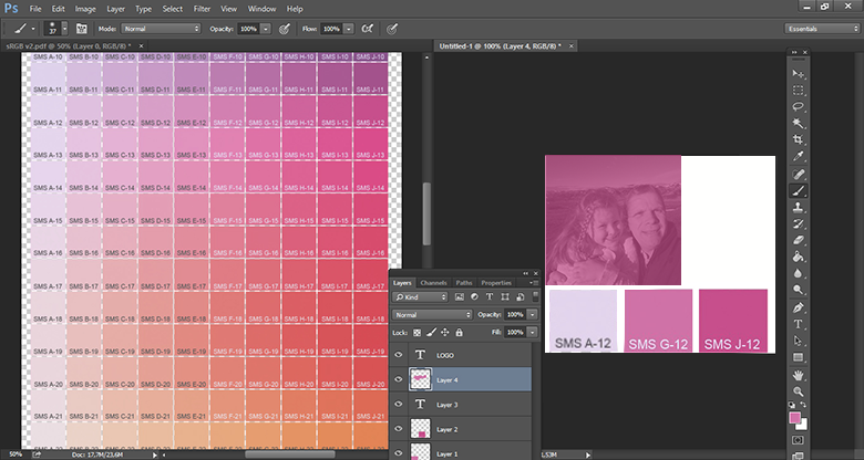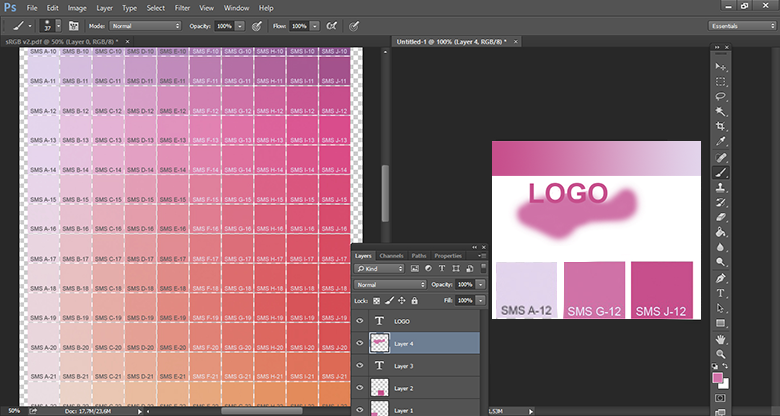 In this example we picked the colours SMS J-12 and SMS G-12 for the logo. If your application enables it, add your SMS colours to your colour palette and name them - SMS A-12 web, SMS G-12 web and SMS J-12 web. Select your colours from this colour palette in your design process. The above examples are done in Photoshop, which does not enable adding and replacing colours in this way, but this is for instance possible if you are working in Adobe Indesign or Illustrator - see https://tech4pub.com/2020/11/14/indesign-tip-find-and-change-colors/ for Indesign and https://www.youtube.com/watch?v=JxyZmvcx5oU for changing colours in Adobe Illustrator. We could strictly speaking have just picked the colour SMS J-12 and then used 70% layer opacity, to achieve a colour similar to SMS G-12. Transparency however has been known to cause problems in output for printing, so the safer approach is to simply pick the SMS colours you want to use, if you don't need to use transparency to achieve a certain effect in your creation. In our example, we also created a smooth gradient with colours ranging from SMS A-12 to SMS J-12, which is why we needed to add the SMS A-12 to the job because when it comes to printing your colours in CMYK, you need to order a CMYK version of each SMS colour that you actually use in your layout, - including the "from" and "to" colours used for gradients, and replace the sRGB colours with CMYK colours. This is necessary in order to keep your complete range of SMS colours exactly correct when we transpose them from one media to another - for instance from web to print or television. If you are feeling adventurous and want to do something completely unique using gradients, you can do that with SMS colours. The same rule applies here: If you want to be able to reproduce your SMS gradient correctly in all media, you need to keep track of your SMS colours and your gradient settings.