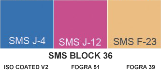 find out which Print Standard is required for your job. The price pr. SMS CMYK colour variation is €30 pr. colour, so if we stick to our example here above, the price for those 3 SMS colours for the first standard you need is €90. The good news is that if you should need to use those SMS colours for another type of paper = another print standard later, the price for all 3 colours will only be €60, because we will turn your 3 colours into one SMS BLOCK, - which looks something like this: