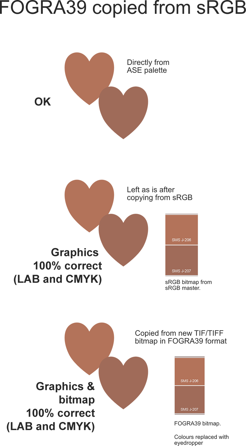 You should use the embedded profile (instead of the working space), - since now you just want to check the LAB values of your colours. Press OK. Make sure to check that the rendering intent is set to "Absolute Colorimetric Rendering Intent". Choosing Absolute Colorimetric Rendering Intent will give you the LAB value of the SMS colours, including the paper white - the same LAB values that your printer should get when he measures the final printed job with a 0/45 spectro measurement device. The LAB values should be the same - or at least extremely close. To check the exact LAB values that should be present, convert your SMS colour palette to the same CMYK format using Absolute Colorimetric Rendering Intent. Just be careful not to save it - unless you save it as for instance P20_FOGRA39format.PDF seperately. If the LAB values of your PDF are not correct, start over. If there is a slight difference between the LAB values and the CMYK values of the bitmap colour cubes and your graphics, or even the original colours in your SMS colour palette in Adobe Photoshop, - don't worry. Affinity Designer and even Adobe Illustrator may export slightly different colours v.s. Adobe Photoshop - but +/- 1 in either the resulting LAB value or a CMYK halftone is something that we are willing to accept. If you are however communicating a CMYK value of your SMS colours remotely however, - just look it up in Adobe Photoshop, - but make sure that you are using the same CMYK icc profile as your printer before you give them the CMYK values. This is quick and easy, but you need to do it correctly. To be clear, using this faster method will result in slight twitching of LAB and CMYK values, compared to picking the colours from each bitmap prepared for each media. But for 90% of customers, it will be good enough, - close enough. Here is a test we did. First we created our job in sRGB format, as you should do when you are working with SMS colours. We made 2 versions. The first one at the top is where we used SMS colours directly from an ASE colour palette we created with those 2 SMS colours. In the middle row we imported the 2 colours in png bitmap format and used the eyedropper to pick the colours from the bitmap and applied them to the hearts. The we saved the file. Next we created a new file in CMYK format using the FOGRA39 icc profile. We then opened the sRGB master and copied both versions from the sRGB master into the new CMYK file. Then we created a 3rd version at the bottom, where we replaced the sRGB bitmap colours with a FOGRA39 format TIFF we created in Adobe Photoshop. We then used the eyedropper to apply the colours from the FOGRA39 bitmap to the hearts at the bottom. This is the only way to get 100 exactly the correct CMYK and LAB values for both the graphics and the bitmap.